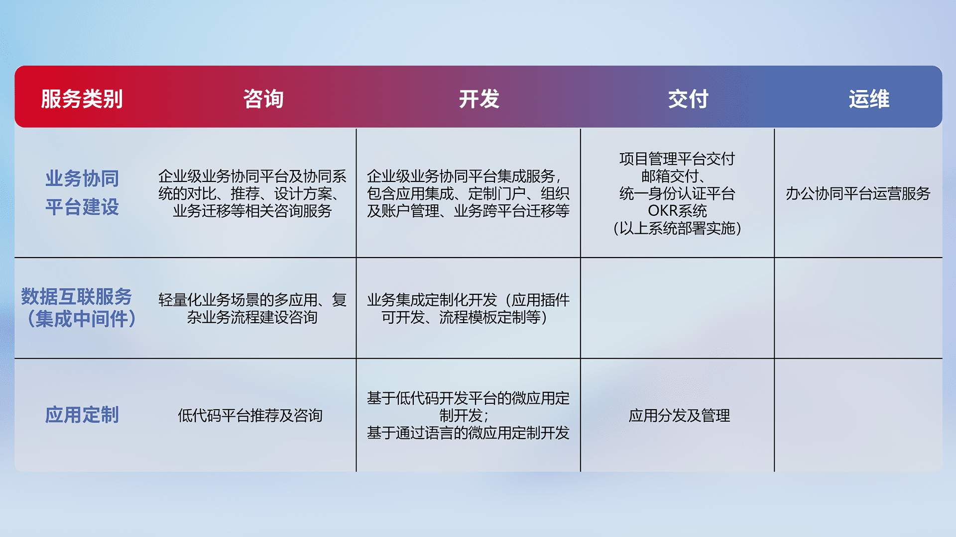 针对钉钉、、企微、、、、IDaas等平台级产品提供产品的规划、、、方案、、、、交付、、、、定制化开发等服务,,,实现如统一协同办公、、、、智能客户服务、、混合会议管理、、、、智能数据查询、、、、等业务场景,,,,实现数字化转型。。