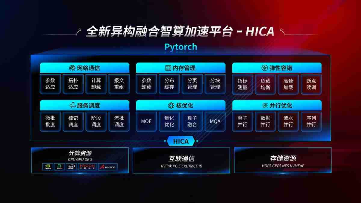 通过自研的服务层、、、、中间适配层、、、以及调度编排算法,,,采用数据并行、、、、模型并行等多种并行方式,,,把并行计算任务进行有效的分解,,,使其分别由相应的软件栈和算力资源来承接。。。当GPU资源变化,,,HICA可以实时动态调度计算子任务并调整模型拓扑和架构,,以充分聚合各种算力资源。。。。