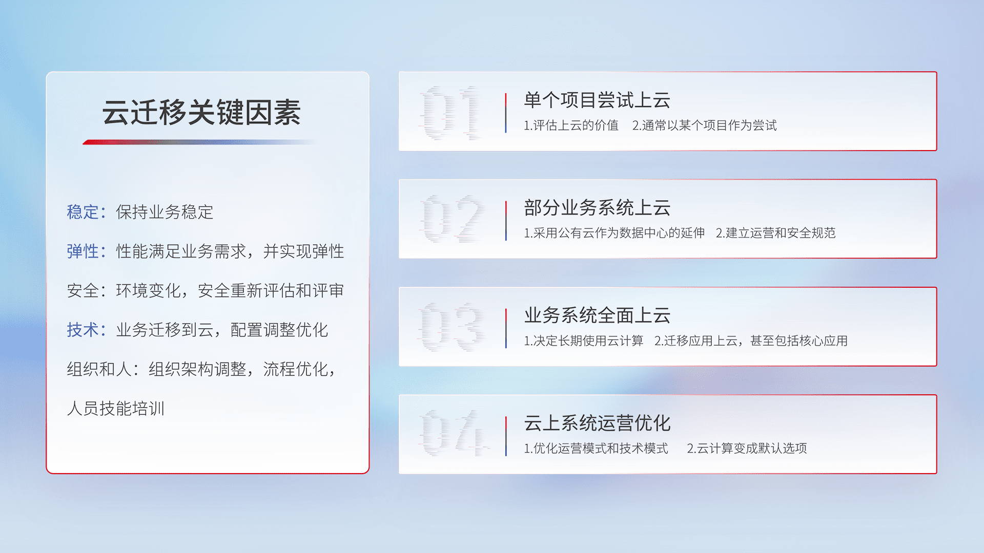 结合实际业务,,,从规划设计、、、云平台选型、、、、云原生改造、、、数据迁移、、集成交付,,,迁移全过程为客户识别最佳上云路径,,,,做好风险识别管理,,设计网络架构、、身份权限、、、、安全审计合规、、、、操作审计、、日志审计、、监控告警策略、、、多站点容灾设计等,,,,对云上基础设施进行整体规划,,,提升IT治理水平,,,以满足弹性、、、、高可用、、、高性能的需求。。