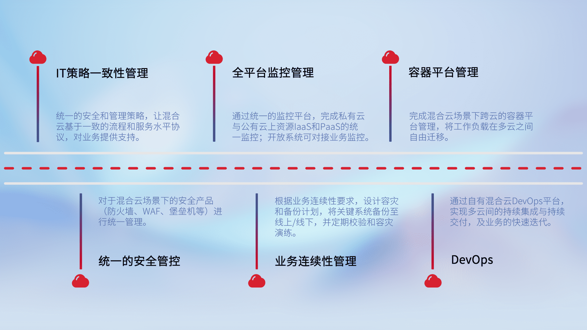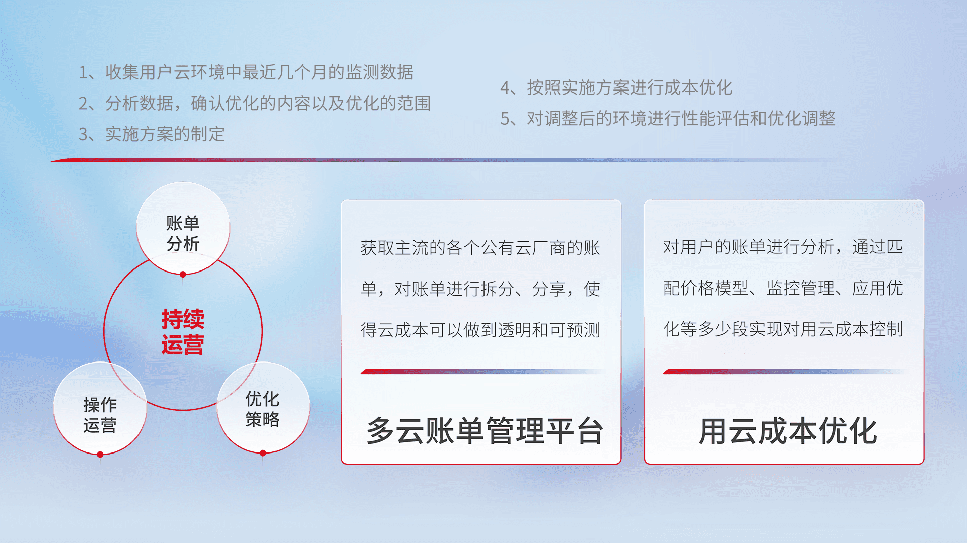 通过多云纳管,,以统一的资源数据模型把客户的云资源进行抽象和封装,,,,进而实现对多云资源的统一操作,,,,保障云资源管理的可靠性、、、稳定性与可用性。。量身定制化运维内容,,,,配置、、、、开发运维、、、、补丁管理、、、备份、、、、监控、、、认证和访问管理、、、、审计和日常巡检等,,,,保障在用云过程中的可靠度,,稳定度以及高可用率。。。。